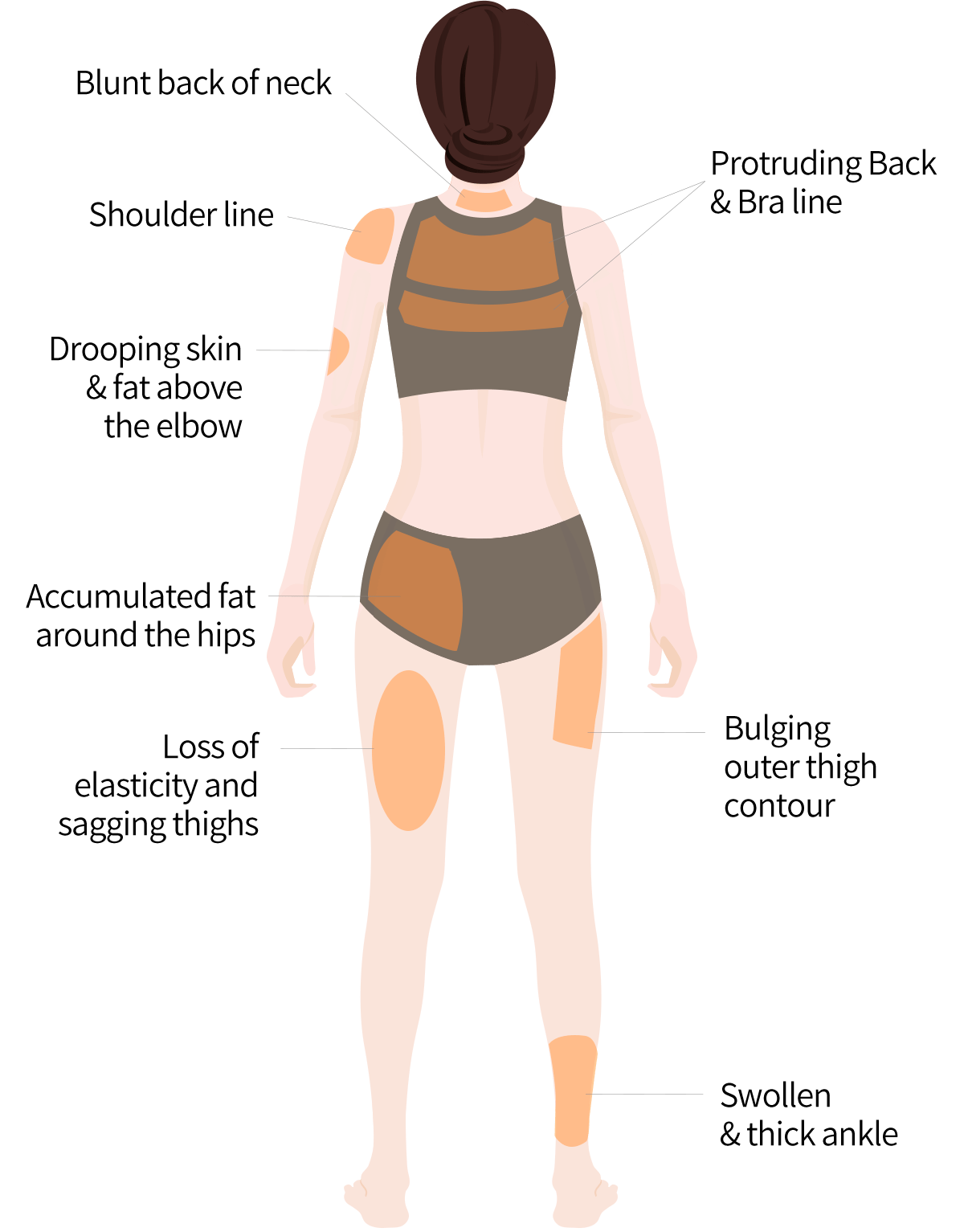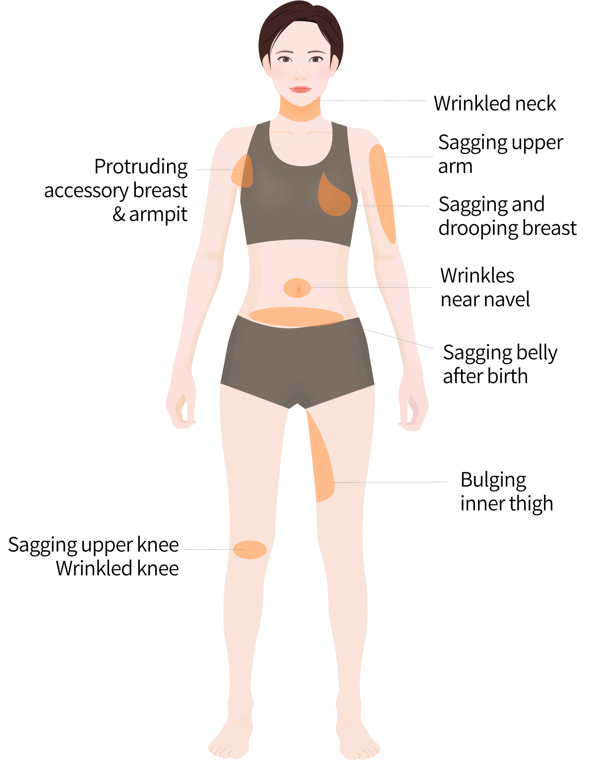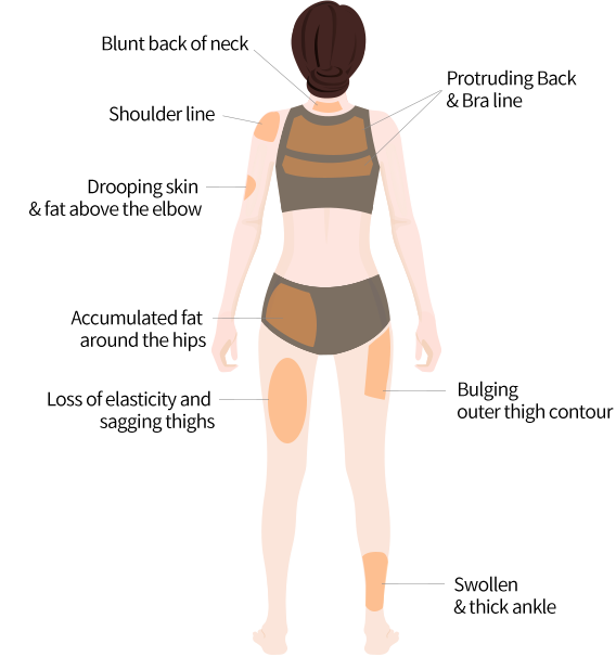 dropped belly and thigh and volume of dented area such as breast
