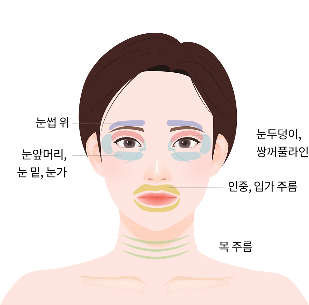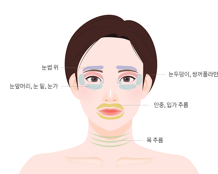 팔자주름, 옆볼, 눈밑 앞광대 등 꺼진 부위는 모아 올려