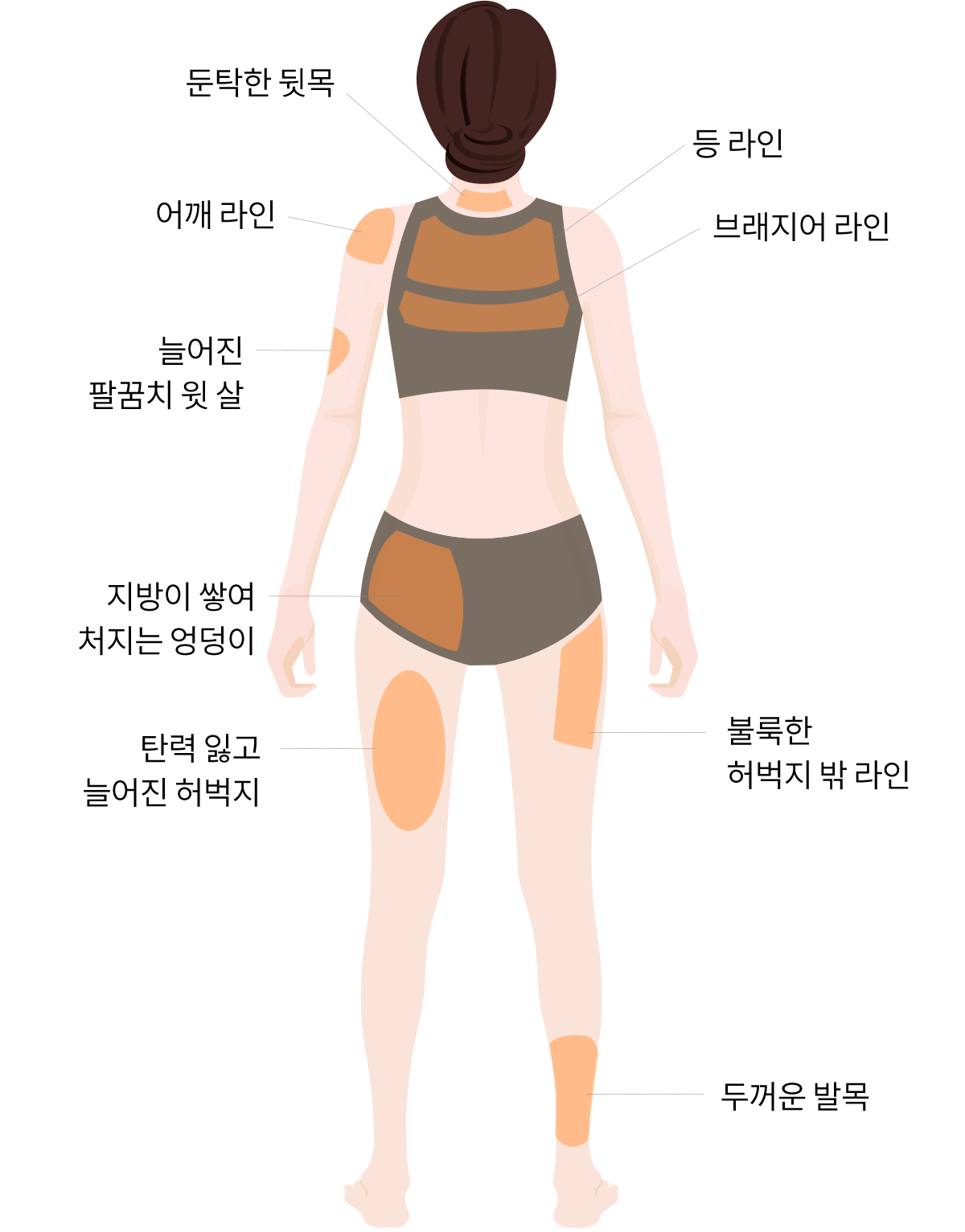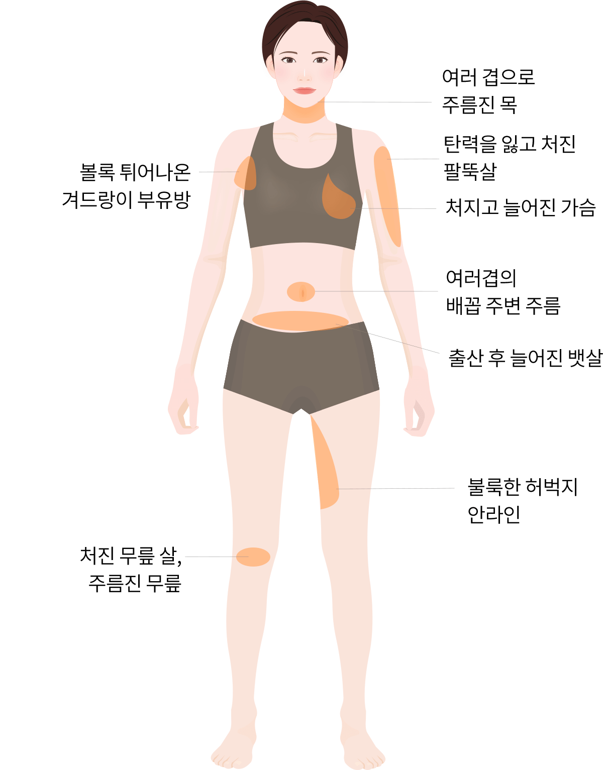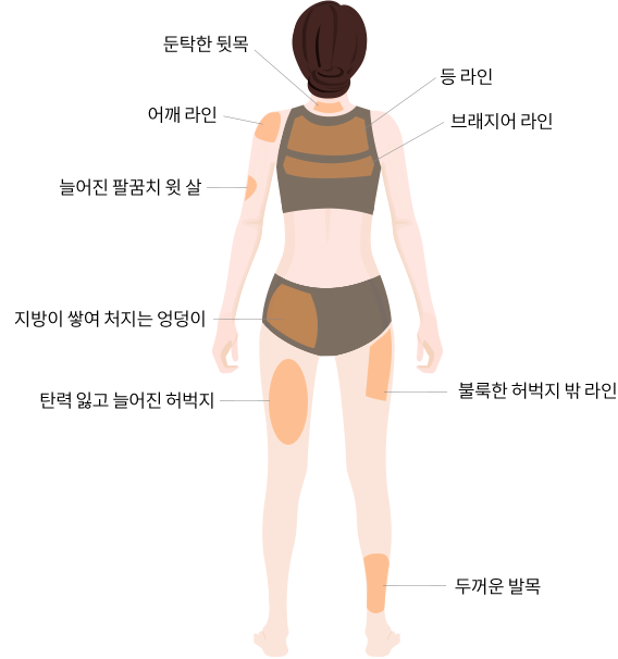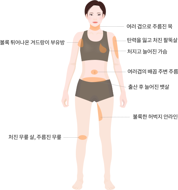 팔뚝, 허벅지, 복부, 무릎, 데꼴떼 등 늘어지고 처진 부위의